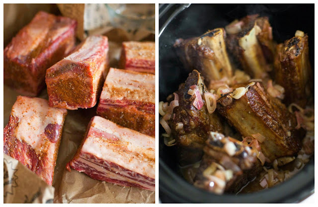 - Add the shallots, lime juice, and water to the skillet, and scrape with a spatula to deglaze the pan. Let the mixture bubble away for 3-4 minutes, and then pour it over the short ribs. Cover the slow cooker and cook on high for 4-6 hours or on low for 8-10 hours, until the meat is very tender and easy to pull apart with a fork. Use tongs to transfer the ribs to a plate or cutting board, discarding the liquid in the slow cooker. Shred the meat with two forks, removing the bones and any excess fat. Serve hot.