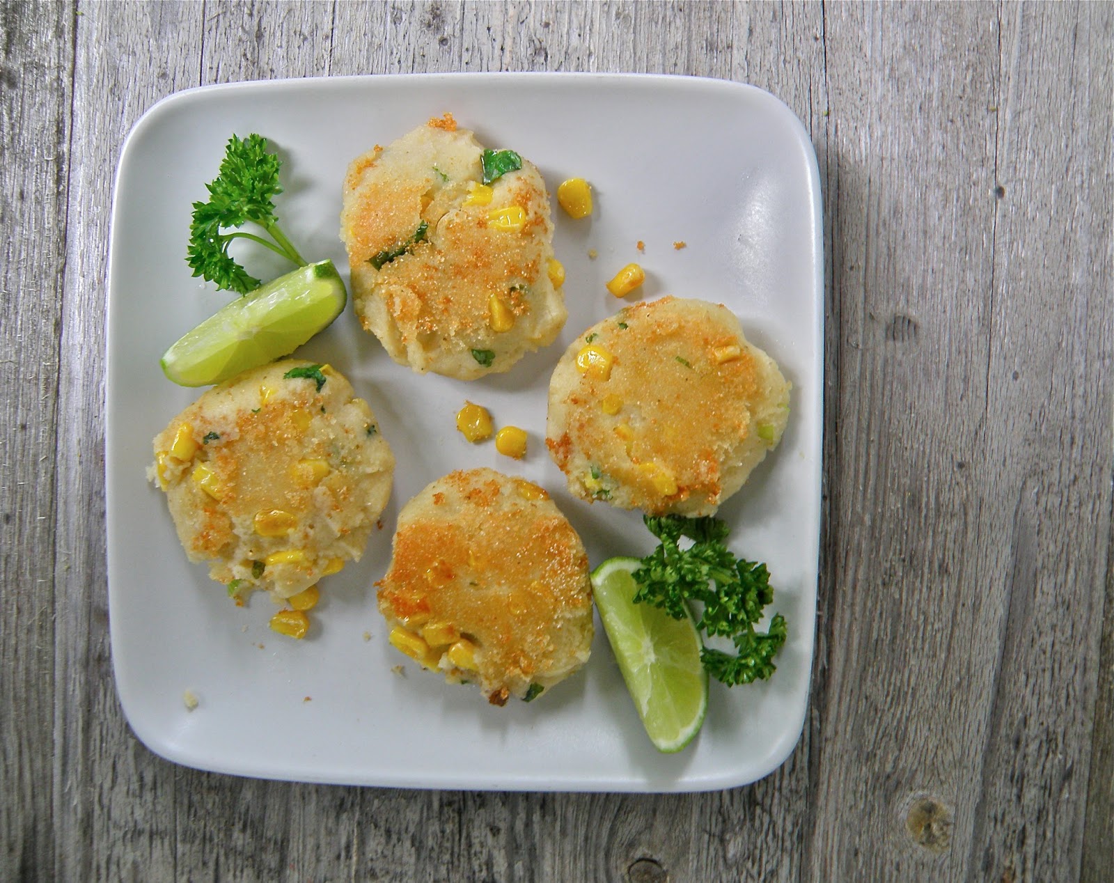 Using your hands, make balls of dough a little larger than golf balls and flatten them slightly to form patties. Fry until golden brown on both sides, about 3 minutes per side. Be gentle when you flip them–you’ll lose a few pieces of corn, but that’s okay.