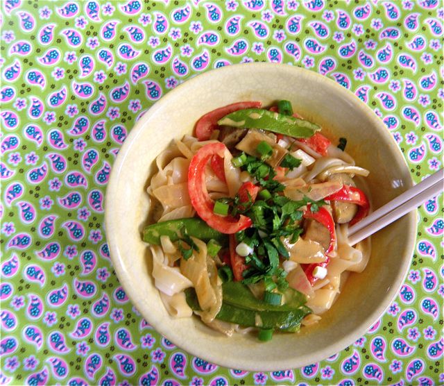 Serve noodles in a bowl with vegetables and curry spooned on top. Garnish with chopped scallions and cilantro and serve hot.