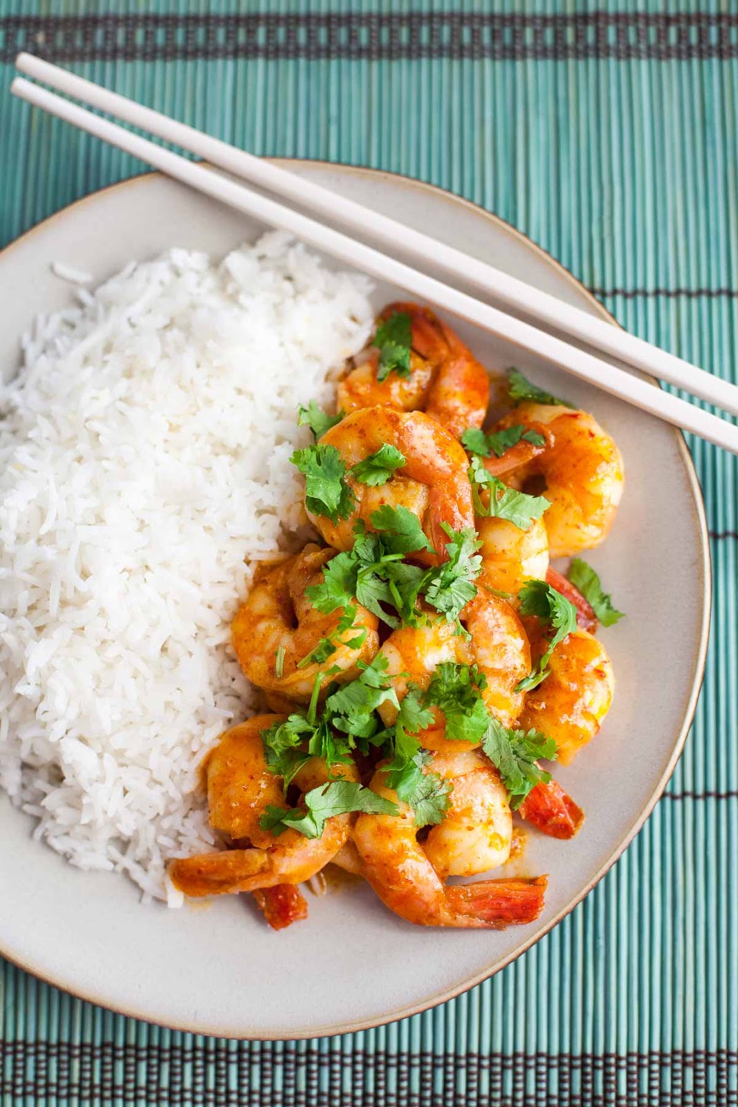 - Turn off the heat, add the remaining tablespoon of butter, and stir until the butter is melted and incorporated. Serve the curry butter shrimp topped with fresh cilantro, alongside white rice or cauliflower rice if desired.
