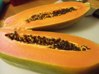 To prepare the papaya, slice it in half and scrape out the seeds and fibers with a spoon.  Score the flesh with a knife and scoop out the chunks with a spoon.