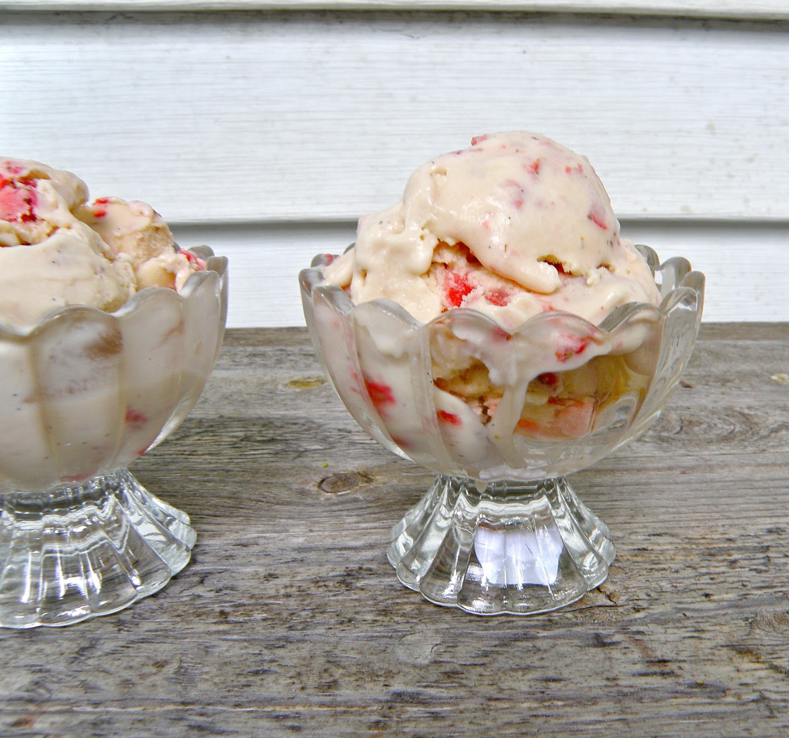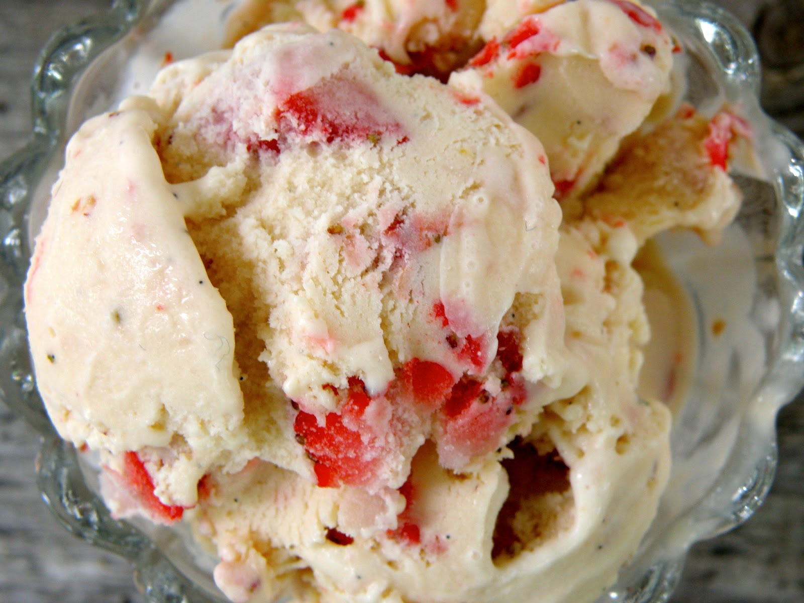 When the custard mixture is completely chilled, freeze in your ice cream maker. A few minutes before the ice cream is ready, add in the strawberries.